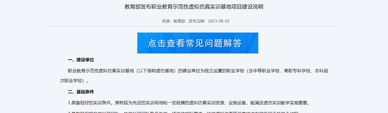 職業(yè)教育示范性虛擬仿真實訓基地(以下簡稱虛仿基地)的建設單位為獨立設置的職業(yè)學校(含中等職業(yè)學校、高職??茖W校、本科層次職業(yè)學校)。